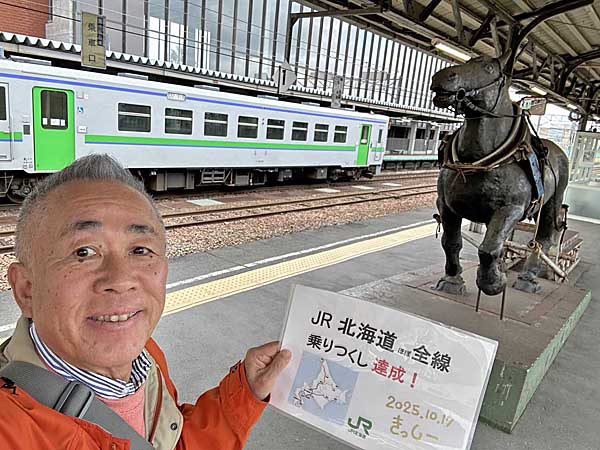 札幌駅♪ 残り3路線 乗り尽くしに向かいます。 ![]() ”JR北海道全線 乗りつくし達成♪” 新幹線・在来線あわせて、約2,373km。 写真は、岩見沢駅で、乗ってきた室蘭線の汽車と、ばん馬像と。 今回は、最後の3路線。 ・JR留萌本線(深川駅~石狩沼田)14.4km 1日7本 15分 ・JR室蘭本線(苫小牧-岩見沢) 111.8km 1日6本 90分 ・JR札沼線〔学園都市線〕(桑園~北海道医療大学)24.4km 1時間に2本ぐらい ※マップの黄色部分 ![]() ![]() ”札幌会場で審査と授与式♪” 全国10都市開催!プログラミング教育EXPO2025ゲーム開発コンテスト 虎の巻動画3本を無料公開~ファミスタの父・岸本好弘氏が語る「面白いゲーム」の極意とは?~ https://prtimes.jp/main/html/rd/p/000000018.000095797.html ![]() ![]() ![]() “健さんゆかりの駅♪” ![]() ![]() ![]() |