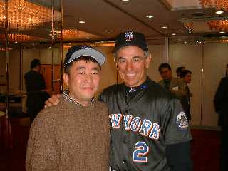 バレンタイン監督と会う(3月28日)あるレセプションで、NYメッツ・バレンタイン監督とお会いしました。"I'm a Marines fun."と話しかけると、「そうですか」とタドタドしい日本語で応えてくれました。ニコニコしていてとてもステキな方でした。 「GABにも素晴らしい選手がいるそうだが、今度、是非メッツにも選手を派遣してくれ」とバレンタイン監督がきっしいに要望。(it's a joke.) 注:GABはきっしいがオーナーを務める草野球チーム。 |