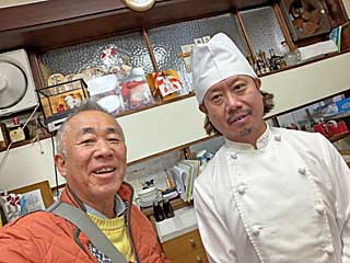 神・中村シェフとツーショット。偶然、厨房から出てきていた。オムライスもカキバタ焼きも彼が調理しています。 |