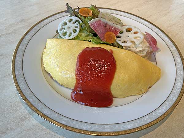 ![]() オムライス910円。ケチャップ、うすやき玉子のせ、ケチャップライスに具はハム、ピーマン、タマネギ。 |