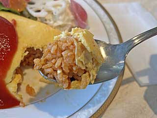 ![]() チキンライスのオムライス1400円(スープ、サラダ、ドリンク、ミニデザートつき)。タマゴは1.5mm厚。中はケチャップご飯。 |
