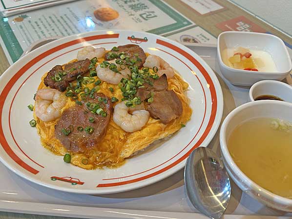 ![]() ワクワクセットオムライスプラスシューマイ980円。ケチャップ、うすやき玉子のせ、ケチャップライスに具はハム、ピーマン、タマネギ。 |
