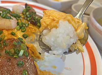 ![]() オムライスワクワクセットプラス ポークジンジャー980円。カゴメケチャップ。タマゴは2.5個分、溶き卵でフワトロ風に仕上げる。ケチャップライス カゴメ(缶)。具は、ハム、タマネギ、ピーマン。甘辛ポークジンジャー2枚。味噌汁は具たくさんで豆腐と油揚げ。 |