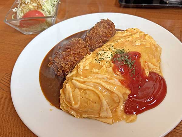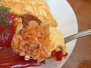 オムライスOmRice650円。液体っぽいデミソース、極薄のタマゴ包み、中はケチャップライスで具は小ハム。東京在住からいうと、東京では出会えない関西らしいオムライス。味は、後半ちょっとあきました。 |