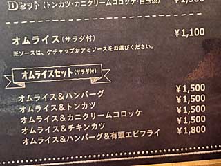 薄皮ぷっくりのオム!オムライス1100円。たっぷりデミ、ごくうすタマゴ、スパイシーケチャップライス。 他の洋食メニューもおいしそう。 |