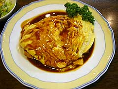 プラスセット350円で、サラダ+スープ+ソフトドリンクがついてくる。オムライスは、ケチャップライスがタマゴ焼きに挟まれ、上にトマトソースがかかる。具は、マッシュルーム、ハム、玉ねぎ。味は薄味というべきか、平凡というべきか。コンソメスープも食後のコーヒーも味が薄い。 |