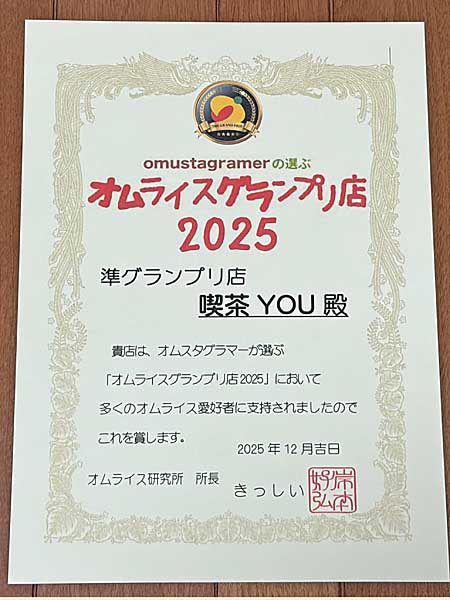 喫茶you鈴木もも子店長に準グランプリ受賞の電話インタビューをしました。Q1. 受賞コメントをお願いします。 「準グランプリに選んでいただきありがとうございます。」 Q2. ずっと人気の秘密は? (過去のオムグラ結果は、2019 グランプリ、2020 第4位、2021-2023 第3位、2024 第4位、2025 準グランプリと、7年間ずーーっと4位以内、こんなお店は日本中探しても他にない) 「うーん、なんでしょう。変わらない味で作り続けているところでしょうか。来年も受賞できるように頑張ります。」 Q3.いつも行列ですが、ねらい目があるなら? 「平日の14-15時がねらい目です。」 |