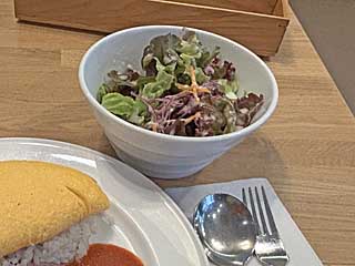 ![]() オムライス(サラダ付)1200円。デミソースにプチトマト。ふわとろタマゴ。中は炊き込み風チキンライス。 食器は、寝台特急「北斗星」で実際に使用していたもの。 |