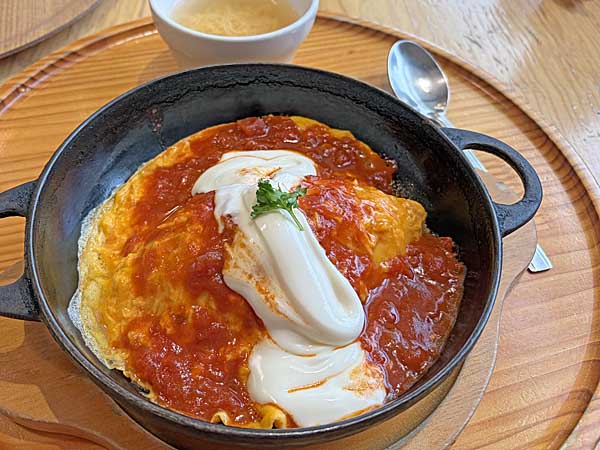 中山のオムライス屋さんのオム!定番オムライスM(サラダ・スープ付)980円。ケチャップとマヨかけ、ふわふわタマゴ包み、ケチャップライス、具なし。 |