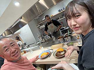 ![]() 調理の様子をのぞき込む同行者。が、秘密は仕切り壁で、見えなくなっていました。 |