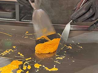 ![]() 役得で、開店前に訪問。同行者は写真撮影係です。未完成オムライス4.0は、全てがタマゴの中に! あと、3.0、4.0はタマゴの表面がピカピカです。 |