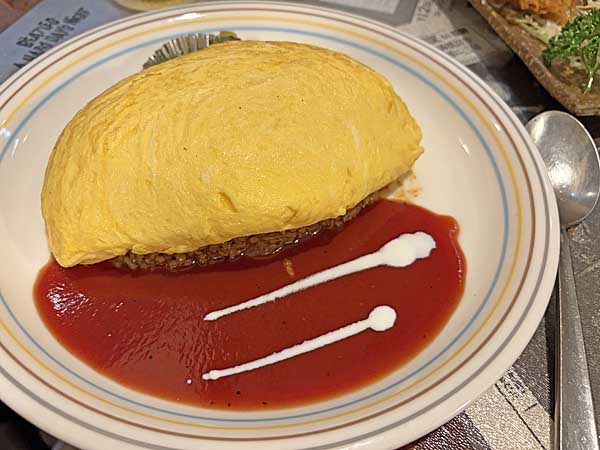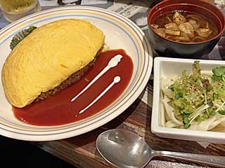 立川のオーダー自由度の高いオム!大人のオムライス(ふわとろ)960円、小鉢、スープ、コーヒーつき。ケチャップ、ふわとろたまごのせ。中はデミライス。 |