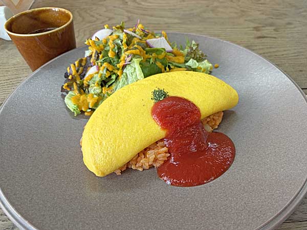 おしゃれカフェの和風オムライス!オムライスset(スープ・ドリンク・サラダ付き)980円。丸いラインのオムライス。ケチャップをかけたしっとりタマゴ、中は和風味ライスに具はツナ。 |