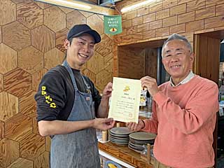 準グランプリ賞状を授与!準グランプリを受賞したtorse店長の山内さんに、皆さんを代表して賞状を渡してきました。 山内さんコメント「投票ありがとうございます。今年は新しいスタッフがたくさん入り練習中の子も多いですが、かわいくて美味しいオムライスをこれからも作って行きたいと思います。」 |