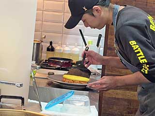 ![]() ひろと店長たちと記念撮影。厨房での白オム作りに注目中。 |