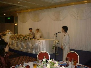 きっしい夫婦、後輩の結婚式に列席!!(10月18日付)本日、きっしい夫婦は恵比寿のウエスティンホテルで行われた会社の後輩・いでまり(愛称)の結婚式に列席した。新婦の職場の先輩の挨拶を引き受けた妻は、行きの目蒲線の中でも、ブツブツと挨拶の練習をしてました。結婚式を無事終えた、石毛君・まりこさんご夫妻は無事ハワイに旅立ったことでしょう。(←四季の旅社のタヒチ旅行に申し込んでいたそうだ) 写真は、緊張の中挨拶をする妻・郁子。 |