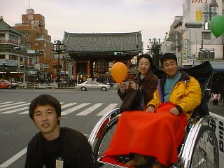 浅草で人力車に乗る!!(2月27日付)浅草雷門も前から、人力車に乗る。「えびす屋」という京都嵐山でも人力車を走らせている会社だそうだ。隅田川コースを頼む。若いお兄さんが観光案内をしながら力車を引っ張ってくれる。初めて乗った人力車は、目線がちょっと高くて眺め良し、乗り心地も良かった。でも、車道を走るので他の車にちょっとドキドキ。5000円はちょっと高めだが、楽しかった。お土産に雷オコシを貰った。 |
