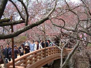 天下一の桜・高遠(4月16日)上諏訪から電車で50分、さらにタクシーで20分、やっとたどり着きましたが、まだ開花していませんでした(涙)。高遠城址の桜は、コヒガンサクラというピンク色かかった桜。満開になると城址がピンク色に埋め尽くされるそうです。開花目前のピンク色の蕾からは、やる気満々さが伝わってきました。 (写真は、桜中継で有名な桜雲橋) |