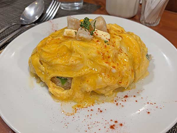 マヨと七味のお正油オム!お正油オムライス(女モリ)1300円。調理直前にタマゴを溶くのは、白身のフワフワ食感を出すため。 |