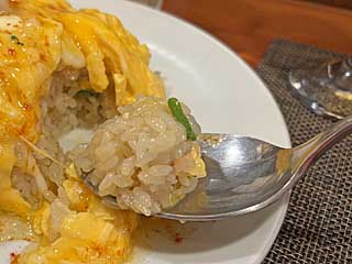 塩チーズオムライス1200円。上に載せたタマゴの上には、パプリカと粉パセリ。中は塩とナンプラーで味付けしたご飯。具は鶏肉、マッシュルーム、赤と黄色ピーマン。ご飯の中にチーズが入ってます。オムライス2個を食べた時点で、2人ともお腹いっぱい。お昼は大きなオムライスで良いが、いろいろ料理を楽しみたい夜はもっと小さめでも良いと思う。 |