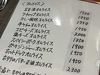 ![]() 全てのオムステッカーが貼ってあります。夜のオムライスメニューは10種類。 |