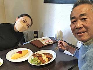 ![]() パンパンのご飯を、2個のタマゴで包むコツをのぞきました。タマゴはヘラを使って横に返す。(許可を得て撮影) ご夫婦と、記念撮影。 |