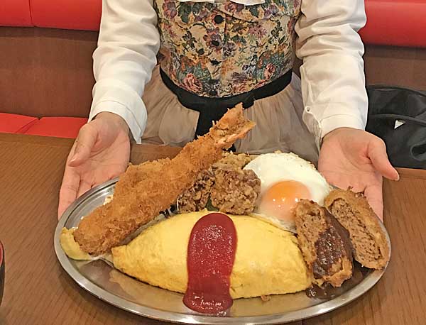 こんなスゴイのを頼んだお嬢さんがいた!!オムライス・全部のせ(エビフライ、ハンバーグ、メンチカツ、カニクリームコロッケ、若鶏の唐揚げ、ポテトサラダ、目玉焼き)3250円。味噌汁付き。 |