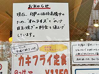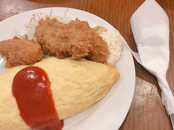 カキフライのっけ!オムライス・カキフライのっけ(味噌汁つき)1300円。正しい昭和のオムライス。カキフライにはタルタルとからしとソース。 |