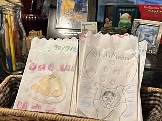 ![]() 表はベーカリーです。奥にカフェレストランがあります。壁に飾られた、イヌとネコがパン食べているイラスト画がかわいかった。 |