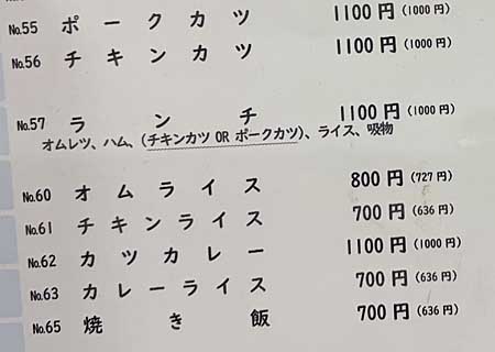 ![]() 中はケチャップライス。イラスト入りで分かりやすいメニュー表、頼める時間もちゃんと書いてある。こういうきっちりしたお店は、まちがいなくおいしい。 |