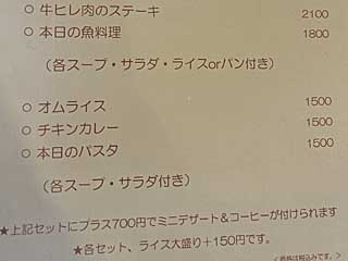 ![]() ![]() 黒板に手書きされたランチメニュー。この日は、オムライスとオムライスハンバーグの2種。スタッフはご主人と奥さんの2人。 |