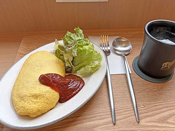 朝7時半から食べられるカフェオムライス!モーニング オムライスセット(コーヒー付き)950円。ケチャップ、完全に巻き込まれたタマゴ。ケチャップライス。少し甘めで、お子様サイズ。 |
