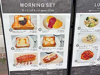 ![]() モーニングセット(~11時)のメニュー。ヒッポは、カバのことです。 |