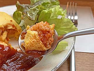 ![]() オムは、デミとケチャップが選べる。サラダ。 |