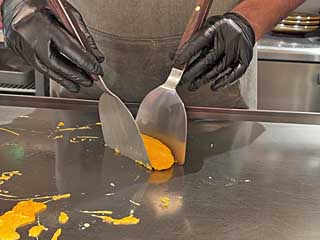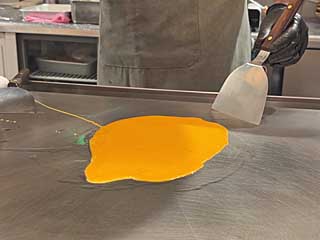 ![]() 出来上がるまで30秒。手空きの時に、スリランカ人のシェフとお話し。修行6ヵ月で一人前に。フライパンの様に火から離すができないのがむずかしい。 自宅のホットプレートでも練習できる。 助手の方は、修行1ヶ月、まだまだ、オーナーのテストに合格すると、お客さん用が作れるようになる。 |