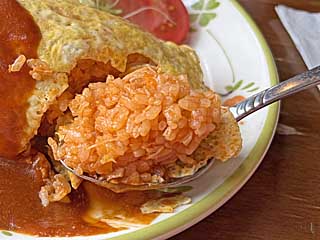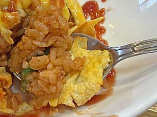 ![]() 中はケチャップライス。メニューに”とりいり”と書いてあるのは、たぶん以前のエビ入りから変わったからだろう。 |