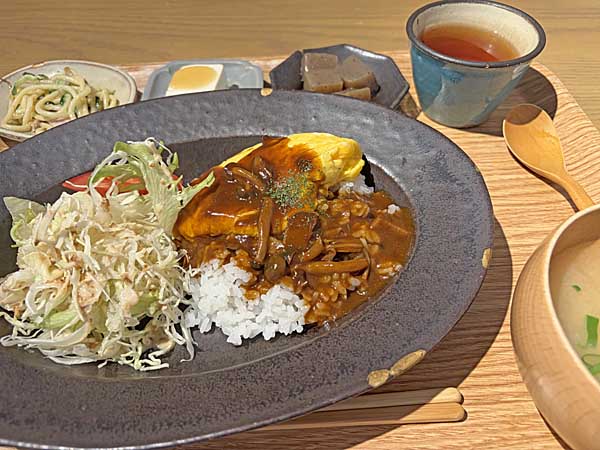 きのこデミソースふわとろオムライス!ふわとろオムライス(きのこデミソース)1350円、味噌汁、小鉢3つつき+コーヒー300円。きのこデミソース(味噌入り)、オムレツのせ、白ご飯。 |
