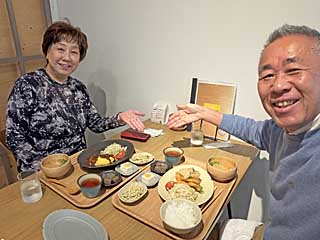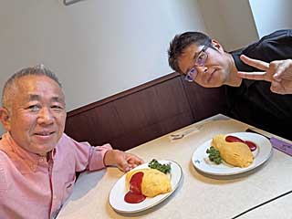![]() オムライスには、いろんなものがのせられます。ご主人夫婦と記念撮影。 |