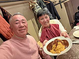 神・中村シェフとツーショット。偶然、厨房から出てきていた。オムライスもカキバタ焼きも彼が調理しています。 |