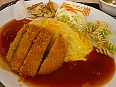 台北の排蛋包!日式猪排蛋包(とんかつオムライス)110元(=300円)、味噌汁つき。 トンカツ、マカロニ、キャベツ、豆腐煮が載る。トマトの形が残るトマトソース、裏返し卵、中は硬めのケチャップライス、具は玉ねぎ。期待してたより美味しかった。硬めのケチャップライスにトマトソースをからめて食べる。トンカツも真っ当、味噌汁は鹿児島のように甘い。プラスチックの小さなスプーンは食べ難い。 オムライス単体だけはなく、海老フライ、から揚げなどの必ずトッピングが付く。ソースは、トマトソースとカレーソースが選べる。 |