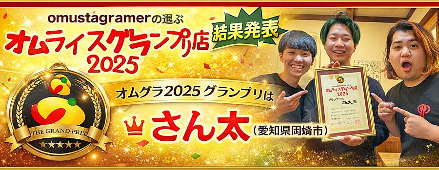 ![]() オムグラ2025 結果発表 オムグラ2025 グランプリは さん太(愛知県岡崎市)が受賞! オムライス愛好家コミュニティ「オムライス研究所」(所長:きっしい)が主催する 「omustagramerの選ぶ オムライスグランプリ2025」 (略称:オムグラ2025) の結果が発表されました。 本アワードは、全国のオムスタグラマーが「2025年中に実際に食べたオムライス店のみ」に投票する方式で実施され、 その年を代表するオムライス店が選出されます。 2025年のグランプリには、 愛知県岡崎市の さん太 が輝きました。 準グランプリには 東京・東銀座の 喫茶you、 第3位には 兵庫県・神戸元町の pagot がランクイン。 中部・関東・関西と、全国各地の名店が上位に選ばれる結果となりました。 受賞店はいずれも、 味わいはもちろん、独創性、提供スタイル、接客の質など、 総合的なオムライス体験が高く評価されています。 各受賞店の詳細データや投票コメント、 賞状授与の様子、店主インタビューなどは、 公式サイトにてご覧いただけます。 ▶ オムグラ2025 公式結果ページ https://www.omurice.com/omurice/omugra2025/ |