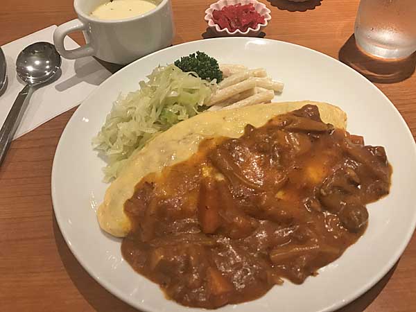 中山のオムライス屋さんのオム!定番オムライスM(サラダ・スープ付)980円。ケチャップとマヨかけ、ふわふわタマゴ包み、ケチャップライス、具なし。 |
