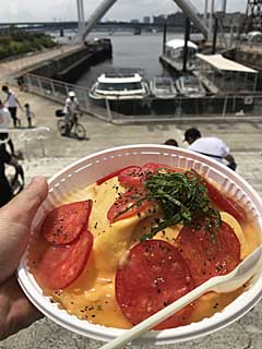 ![]() オムライス日本一決定戦!テーブル席が一杯だったので、シーサイドデッキの階段に。海風に当たりながらオムライスを食べます。 |