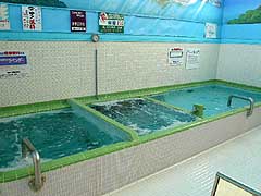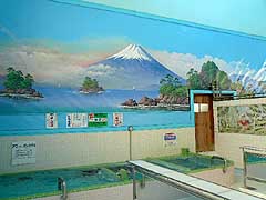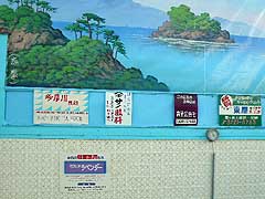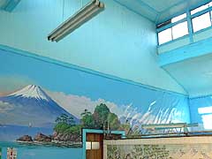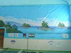 ●男湯浴場 「ペンキ絵」は志摩の海(06年3月から)。湯舟は奥に3つ。 ![]() ペンキ絵下の広告看板もレトロです。 ![]() |