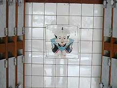 煙突に泳ぐコイノボリ。JR高円寺北口から徒歩8分。見上げて写真撮ってる人がいます。客8人。海のタイル画。牛乳110円。「蒲田から来ました」と言ったら、TVにも出ていたおじさんが親切に説明してくれました。ロビーで駄菓子や自家製おにぎりを売ってます。佐渡米のおにぎり買いました。